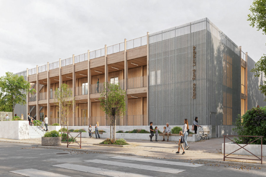 Bioclimatisme, biosourcé, géosourcé, économie circulaire : tout est dans le projet. La structure hybride bois-béton bas carbone s’appuie sur des filières locales (bois labellisé Pyrénées et Massif Central, briques de terre cuite en réemploi régional). La ventilation naturelle hybride avec tirage thermique et surventilation nocturne garantit qualité d’air et confort dans toutes les salles de classe — sans recours à la climatisation. Le confort d’été est assuré par protections solaires passives, toitures végétalisées et îlots de fraîcheur.