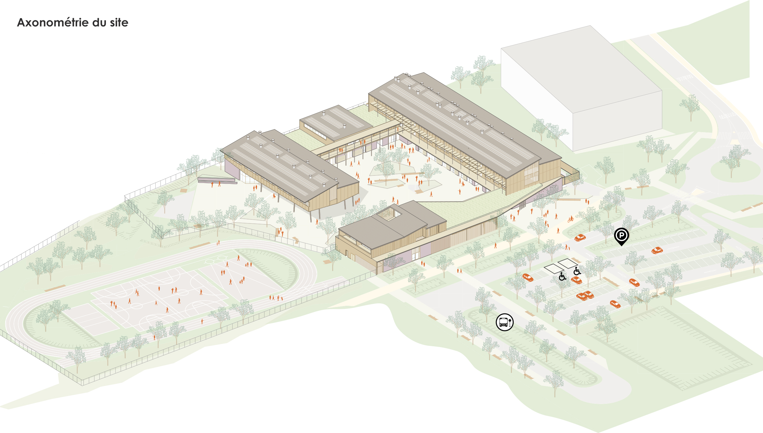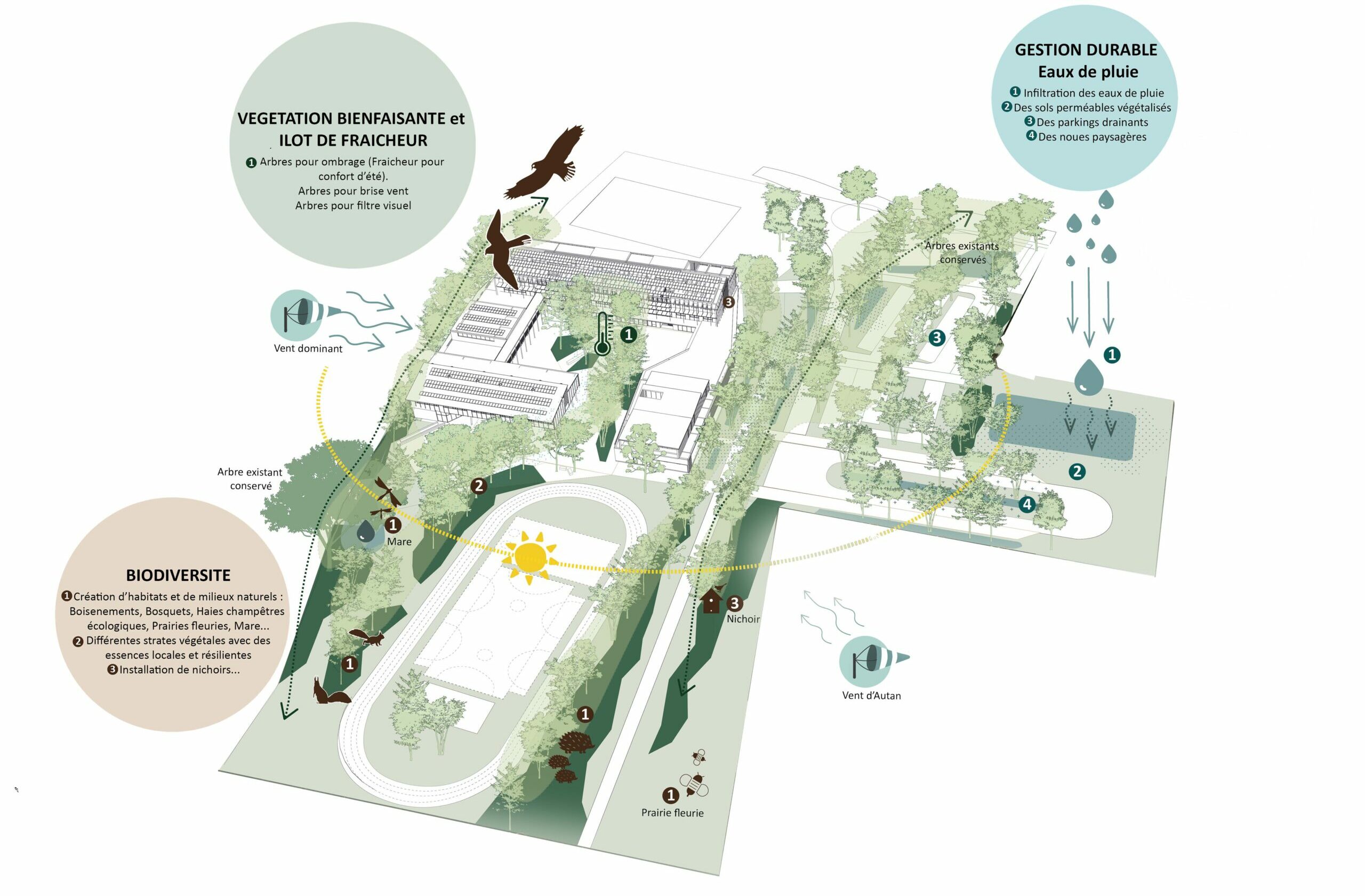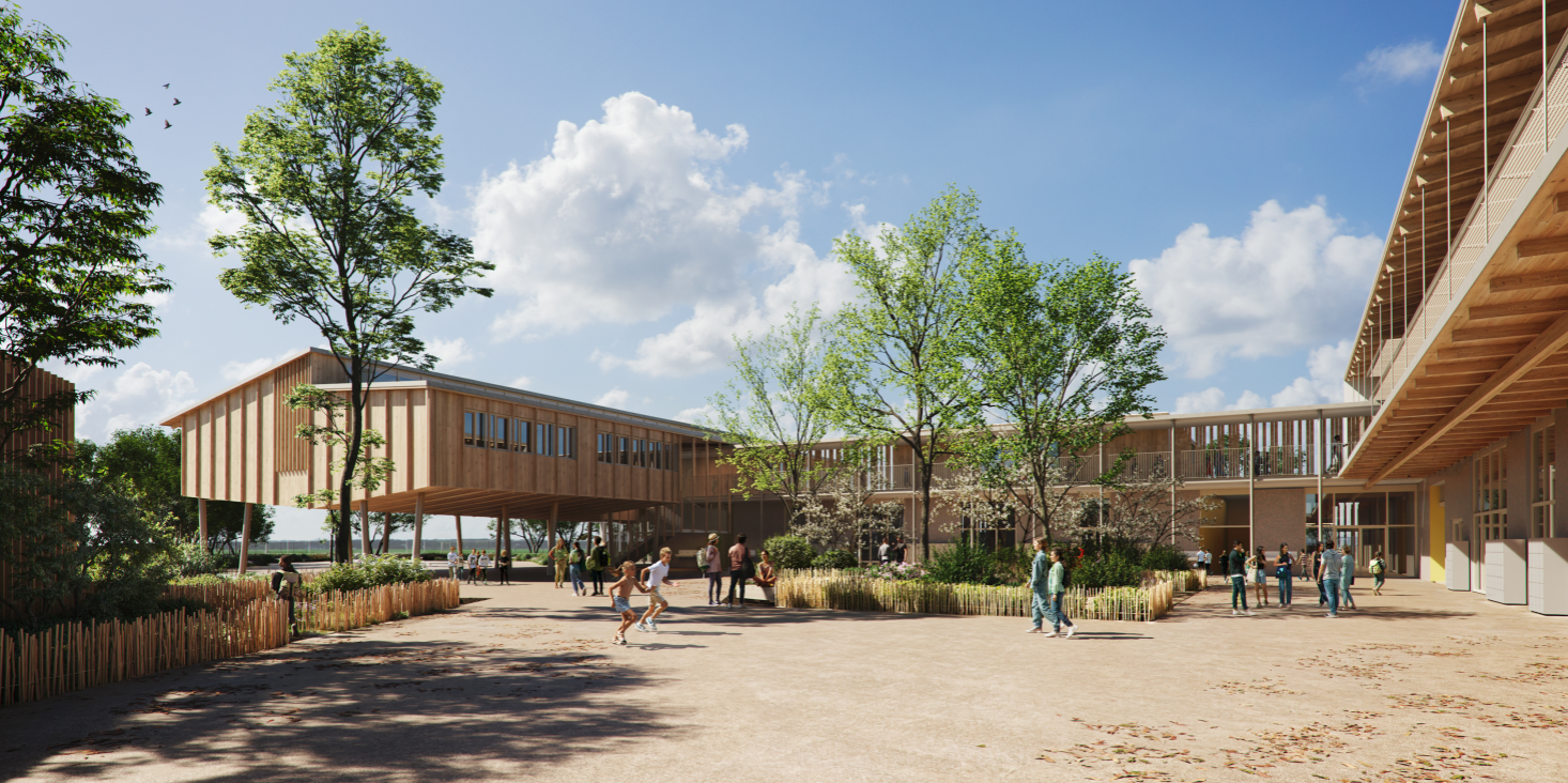 Ce futur établissement scolaire est conçu dans une approche résolument durable, intégrant dès les premières esquisses une réflexion bioclimatique approfondie sur l’implantation et l’orientation des bâtiments. Une attention particulière a été portée à l’utilisation de matériaux biosourcés, favorisant à la fois confort, performance énergétique et empreinte carbone réduite.