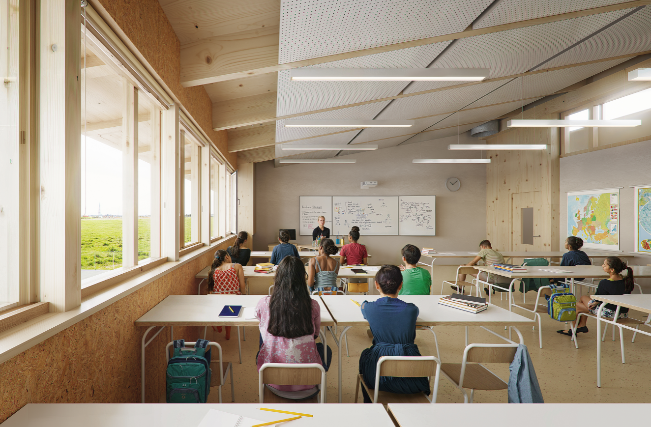 Le projet inclut également une ventilation naturelle optimisée pour toutes les salles de classe, permettant de combiner qualité de l’air intérieur et solutions techniques adaptées aux contraintes éducatives. Ces choix contribuent à un environnement sain et agréable pour les élèves et le personnel.