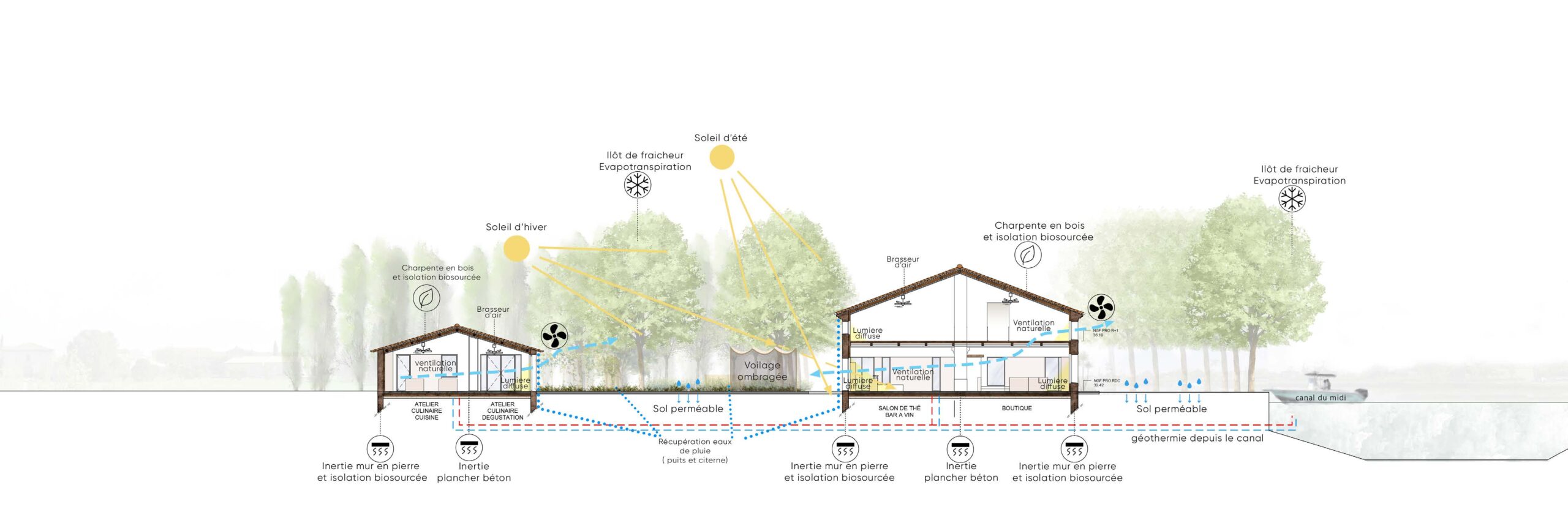 Le confort intérieur sera assuré par des panneaux rayonnants chauffants et rafraîchissants, alimentés par des forages géothermiques, garantissant à la fois performance énergétique et sobriété. La solution intègre également une ventilation naturelle, couplée au dispositif géothermique, pour assurer un confort sanitaire optimal et permettre une surventilation nocturne favorisant la régulation thermique et la qualité de l’air intérieur.